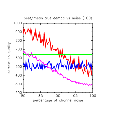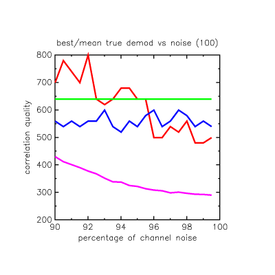 The RED line is the best decode seen for the correct match offset, the BLUE line is the best decode for all other (wrong) offsets. The PURPLE line is the mean decode for the correct match offset over the 100 runs. GREEN is the "quality cutoff" basically keeping us from getting near the blue line's false hits: because of the properties of the code it is extremely unlikely noise will get near the green line.